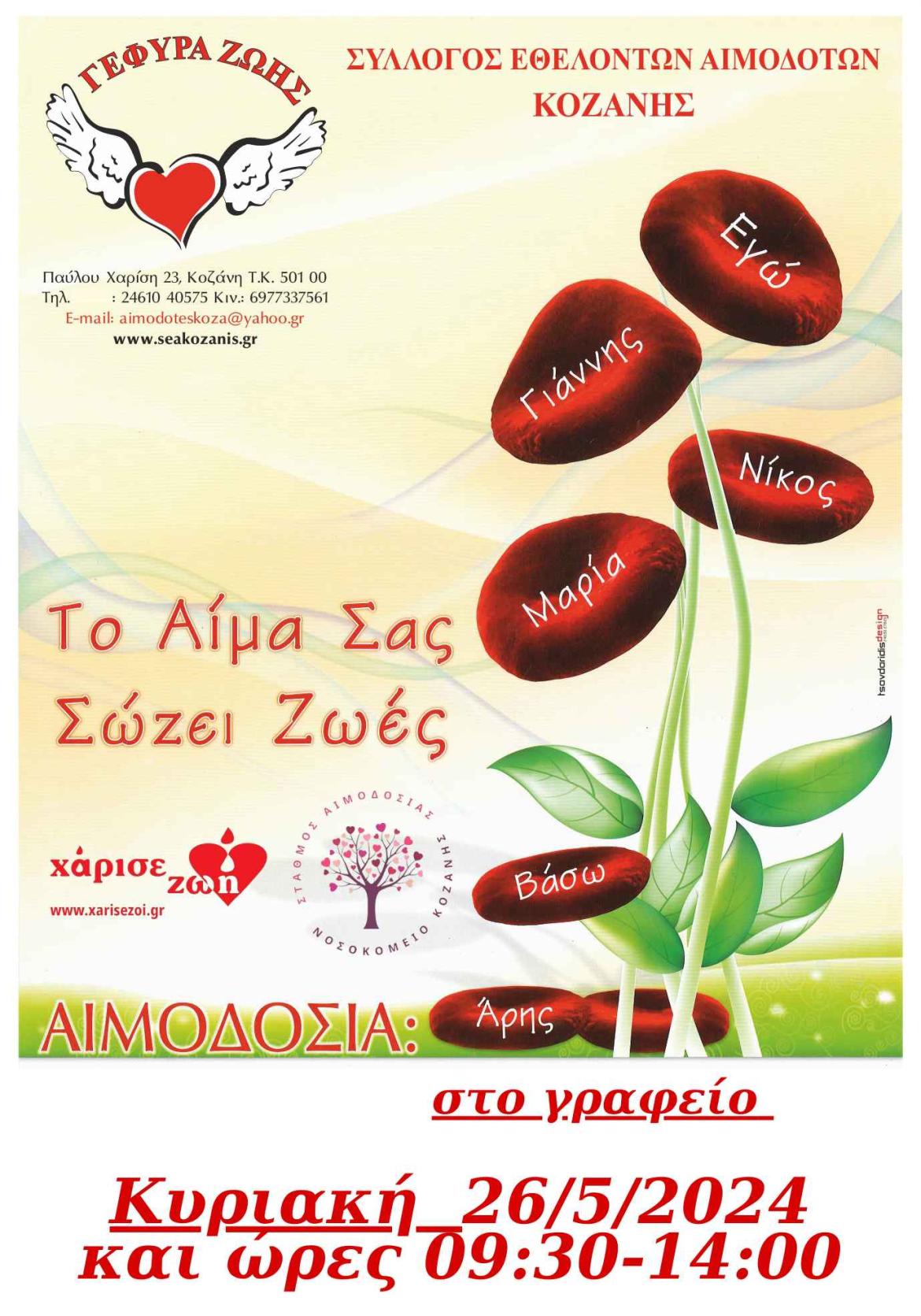 Την Κυριακή 26 Μαΐου 2024 αιμοδοτούμε από τις 09:30 – 14:00 στα γραφεία μας Π.Χαρίση 23 σε συνεργασία με την Αιμοδοσία του «Μαμάτσειου» Γ.Ν. Κοζάνης.