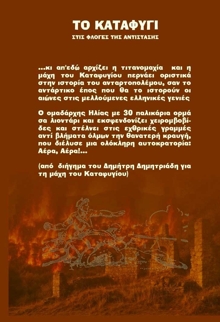 «Θα γράψω γι’ αυτήν την αγνοημένη ,την περιφρονημένη και συκοφαντημενη, μα περήφανη και αξια γενιά των Καταφυγιωτών αγωνιστών της Αντιστασης. Για τη μεγάλη μάχη και τη λαμπρή νίκη των ανταρτών. Για την πυρπόληση και την καταστροφή του χωριού. Θα γράψω την Αλήθεια».