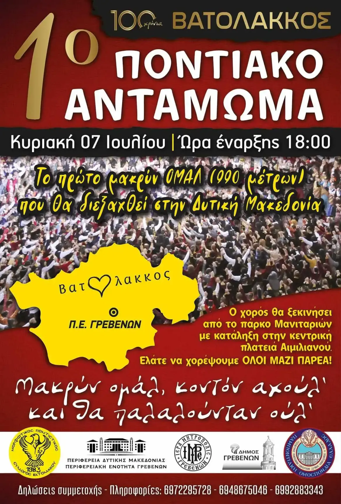100 χρόνια Βατόλακκος! O Μορφωτικός Πολιτιστικός Σύλλογος Βατολάκκου διοργανώνει το “1ο Ποντιακό Χορευτικό Αντάμωμα“. Σύλλογοι από τη Δυτική Μακεδονία, την Ήπειρο και από άλλα μέρη της Ελλάδας με τα χορευτικά τους θα συμμετάσχουν στην διοργάνωση του μεγάλου «ΟΜΑΛ».