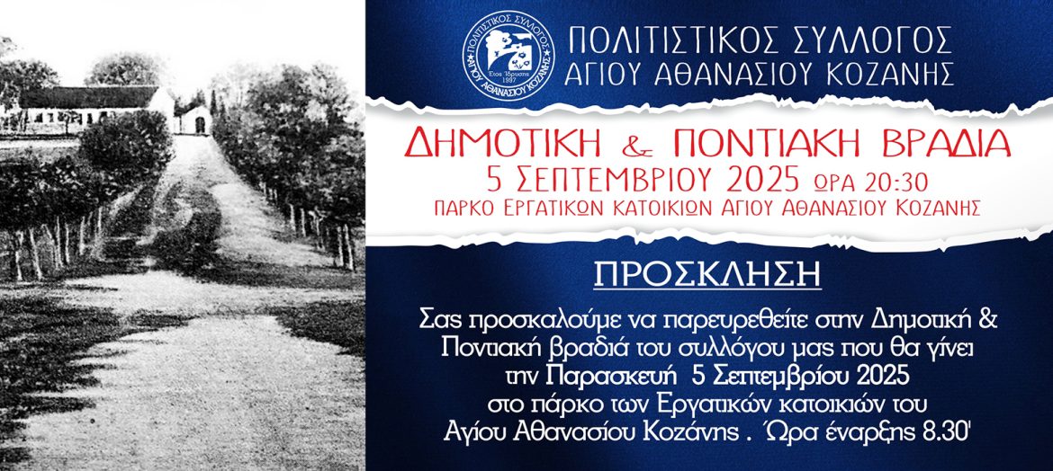 Ο Σύλλογός μας διοργανώνει ΠΑΡΑΔΟΣΙΑΚΗ ΔΗΜΟΤΙΚΗ ΚΑΙ ΠΟΝΤΙΑΚΗ ΒΡΑΔΙΑ στον χώρο του πάρκου των Εργατικών κατοικιών του Αγίου Αθανασίου. Καλούμε όλους τους φίλους και τα μέλη του συλλόγου μας την Παρασκευή 5 Σεπτεμβρίου στις 8.30΄ μ.μ να συμμετέχουν ενεργά και να διασκεδάσουμε όλοι μαζί.