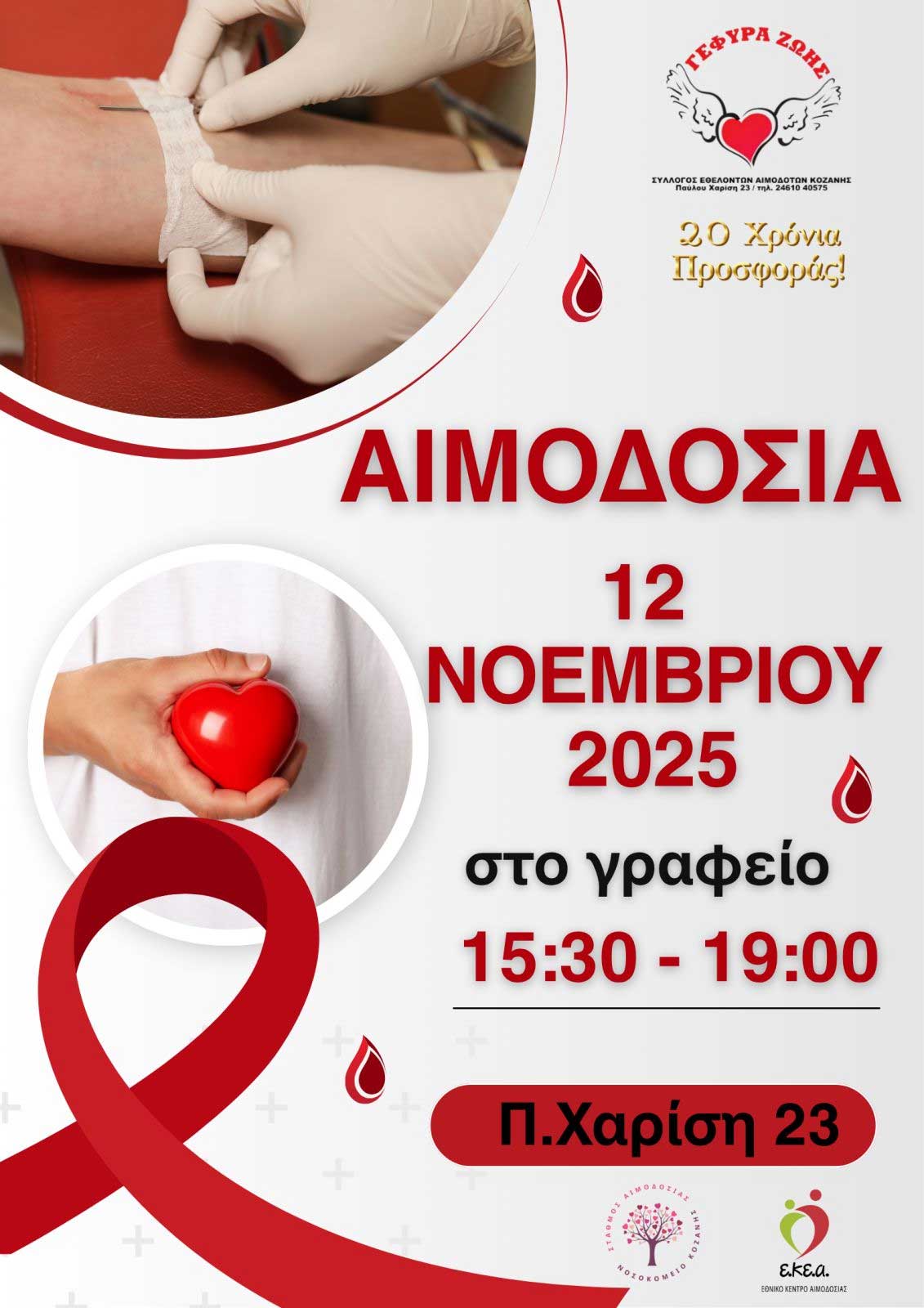 Την Τετάρτη 12 Νοεμβρίου 2025 αιμοδοτούμε από τις 15:30 – 19:00 στα γραφεία του Συλλόγου, Π. Χαρίση 23 με το τμήμα Αιμοδοσίας του “Μαμάτσειου” Γ. Ν. Κοζάνης.