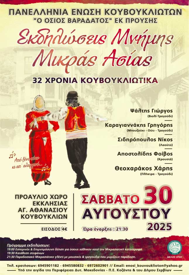 Η Πανελλήνια Ένωση Κουβουκλιωτών «Ο Όσιος Βαραδάτος» εκ Προύσης διοργανώνει το Σάββατο 30 Αυγούστου 2025 τις καθιερωμένες Εκδηλώσεις Μνήμης Μικράς Ασίας, τιμώντας την προσφυγική μνήμη και την παράδοση στο προαύλιο Εκκλησίας Αγίου Αθανασίου Κουβουκλίων στις 21:30.