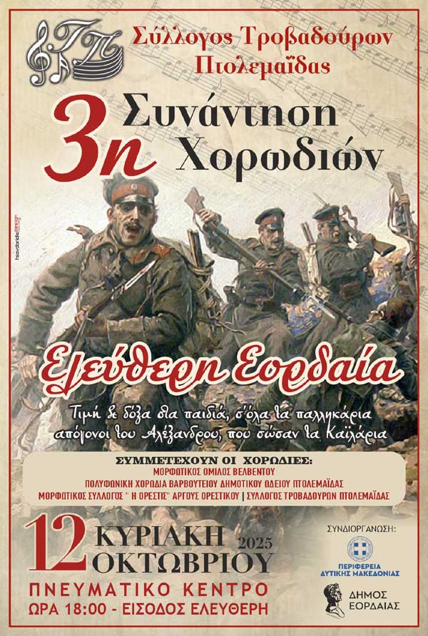 Ο Σύλλογος Τροβαδούρων Πτολεμαΐδας σας προσκαλεί στην 3η Συνάντηση χορωδιών ¨Ελεύθερη Εορδαία” η οποία εντάσσεται στις εκδηλώσεις για τα Ελευθέρια της Πτολεμαΐδας από τον τουρκικό ζυγό.