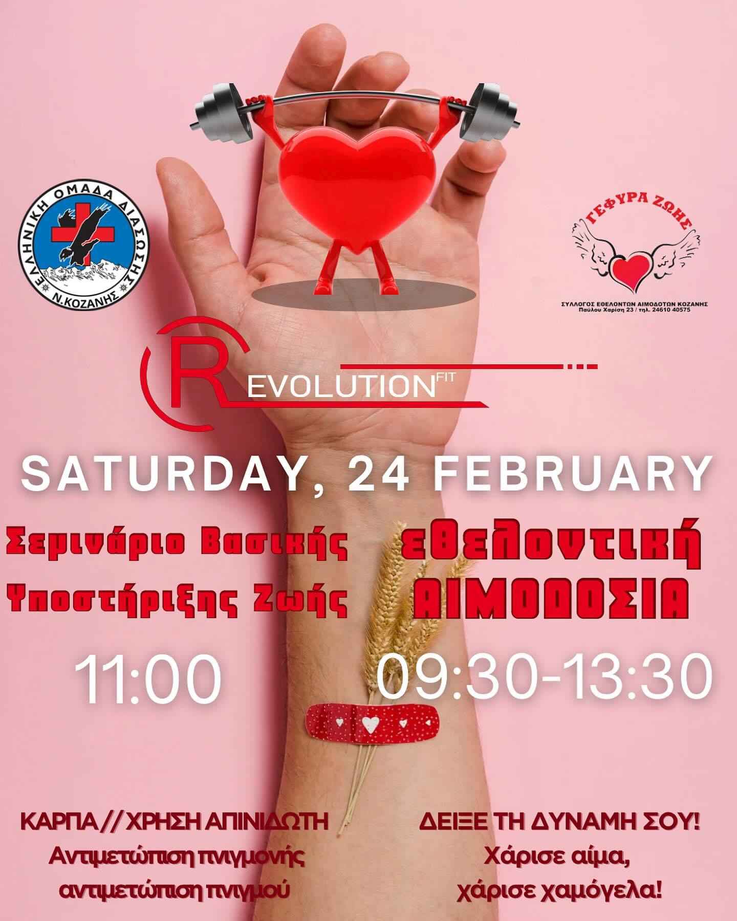 Η 6η Αιμοδοσία του 2024 γίνεται τo Σάββατο 24 Φεβρουαρίου 2024 από τις 09:30 – 14:00 (προσέλευση μέχρι 13:30) στο χώρο του γυμναστηρίου Revolution Fit (Ματιώς Σακελλαρίου 2) με την Αιμοδοσία του Γ.Ν. Κοζάνης.
