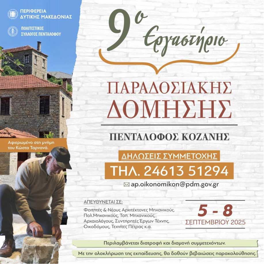 Η τέχνη της παραδοσιακής αρχιτεκτονικής αναβιώνει για ακόμη μία χρονιά στον Πεντάλοφο Κοζάνης. Από τις 5 έως τις 8 Σεπτεμβρίου 2025 θα πραγματοποιηθεί το 9ο Εργαστήριο Παραδοσιακής Δόμησης, αφιερωμένο στη μνήμη του Κώστα Ταρτανά, συνεχίζοντας μια σπουδαία προσπάθεια για τη διάσωση και ανάδειξη της πολιτιστικής μας κληρονομιάς.