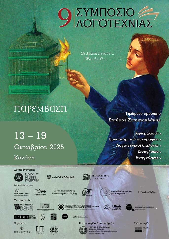 Το 9ο Συμπόσιο Λογοτεχνίας πρόκειται να πραγματοποιηθεί στην Κοζάνη στις 13-19 Οκτωβρίου, με τιμώμενο πρόσωπο τον Συγγραφέα και Πρόεδρο της Εθνικής Βιβλιοθήκης, Σταύρο Ζουμπουλάκη. Το φετινό Συμπόσιο λογοτεχνίας είναι ιδιαίτερα ανανεωμένο και διευρυμένο. Περιλαμβάνει εισαγωγικές εκδηλώσεις, που στόχο έχουν να φέρουν πιο κοντά τη λογοτεχνία σε διαφορετικές ομάδες κοινού: μαθητές, άτομα με αναπηρία και φίλους της μουσικής, δημιουργώντας ένα ζωντανό προοίμιο πριν από το κύριο πρόγραμμα. Ταυτόχρονα, το συνεδριακό τριήμερο του 9ου Συμποσίου ξεχωρίζει για την πολυφωνία και τον πλούτο των θεματικών του, περιλαμβάνοντας Αφιερώματα, Εργαστήρια του Συγγραφέα, Λογοτεχνικούς διαλόγους, πλήθος εισηγήσεων, καθώς και μία εκδήλωση οίνου, λόγου και μουσικής, με στόχο να αναδείξει τον διάλογο ανάμεσα στη λογοτεχνία, την κοινωνία και τη σύγχρονη πραγματικότητα.