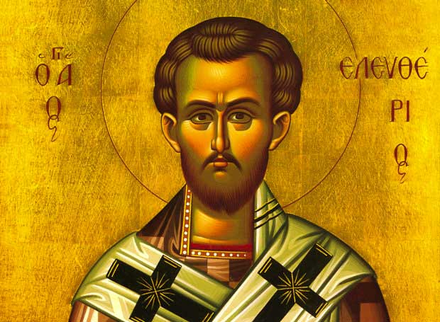 Ελευθέριος ο θαυμαστός και ένδοξος Ιερομάρτυρας έλαμψε ως φωτεινό αστέρι κατά το δεύτερο ήμισυ του δευτέρου αιώνος. Οι γονείς του πλούσιοι και ευγενείς και ως την πίστη ευσεβέστατοι. Η μητέρα του Ανθία διδάχτηκε την Αλήθεια από μαθητές του Αποστόλου Παύλου. Από την μητέρα του έλαβε το όνομα Ελευθέριος και τον ανέθρεψε ευσεβώς. Ο πατέρας του πλούσιος, κοιμήθηκε μετά από λίγο καιρό από την γέννηση του Ελευθερίου. Έτσι έμεινε με την μητέρα του, η οποία τον έδωσε εις τον Αρχιερέα της Ρώμης για να του μάθει τα ιερά γράμματα.