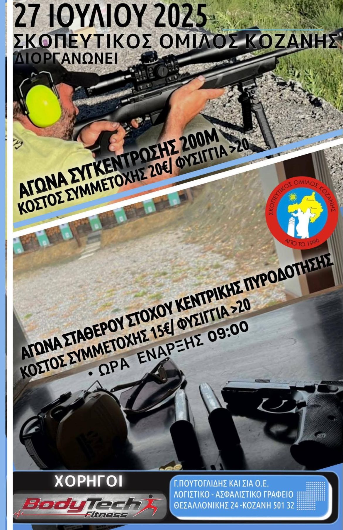 Αγώνα συγκέντρωσης 200μ και σταθερού στόχου κεντρικής πυροδότησης διοργανώνει ο Σκοπευτικός Όμιλος Κοζάνης 27 Ιουλίου