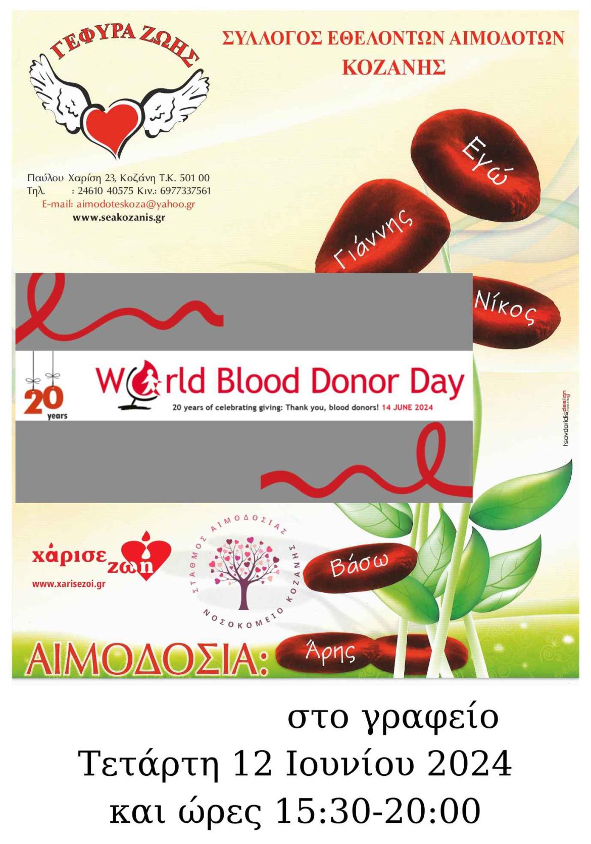 Αιμοδοτούμε 12-6-2024 ημέρα Τετάρτη και ώρες 15:30 – 20:00(προσέλευση μέχρι 19:30) για την Παγκόσμια Ημέρα Εθελοντή Αιμοδότη στο χώρο του συλλόγου, σε συνεργασία με την Αιμοδοσία του Γ.Ν. Κοζάνης. Φέτος ο Παγκόσμιος Οργανισμός Υγείας (Π.Ο.Υ.) στις 14 Ιουνίου γιορτάζει 20 χρόνια Παγκόσμιας ημέρας εθελοντή Αιμοδότη και ευχαριστεί όλους όσους δίνουν ζωή με το αίμα τους.
