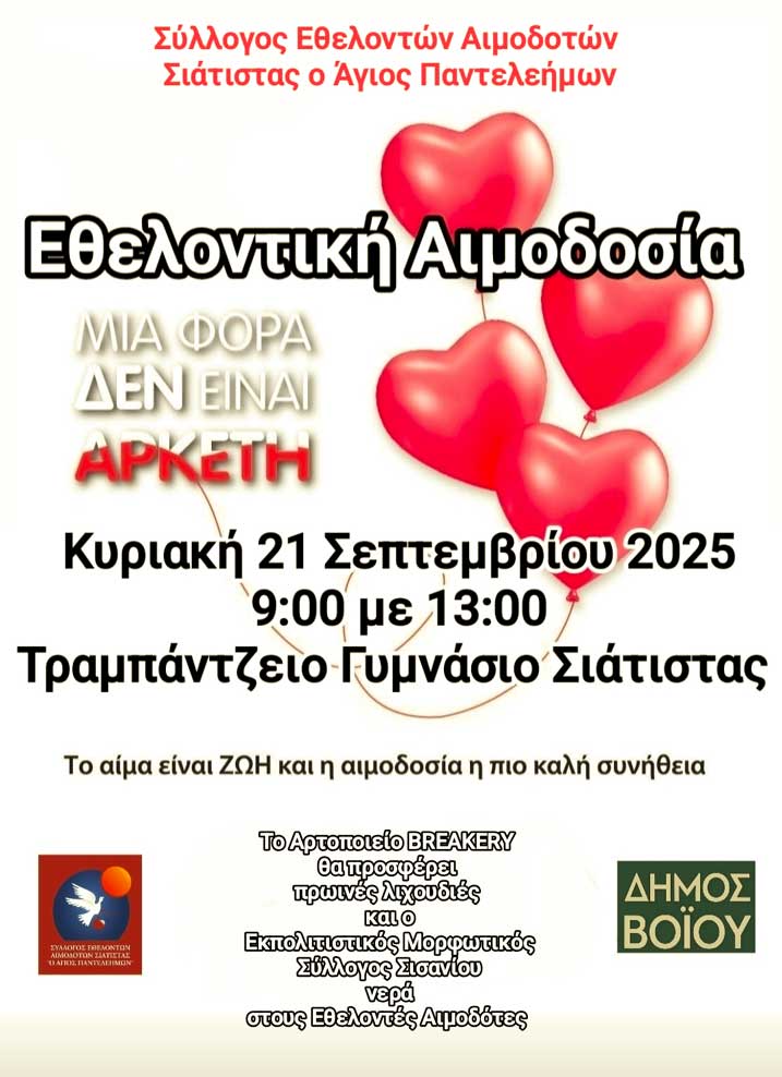 Ο Σύλλογος Εθελοντών Αιμοδοτών Σιάτιστας “Ο Άγιος Παντελεήμων” θα πραγματοποιήσει Εθελοντική Αιμοδοσία, την Κυριακή 21 Σεπτεμβρίου 2025 στο Τραμπάντζειο Γυμνάσιο Σιάτιστας, από τις 9:00 π.μ. εώς τη 13:00 μ.μ..