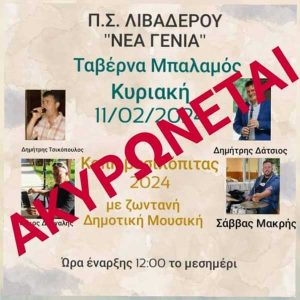 Ακυρώνεται η κοπή πίτας του ΠΣ Λιβαδερού ΝΕΑ ΓΕΝΙΑ που είχε προγραμματιστεί για την Κυριακή 11 Φεβρουαρίου