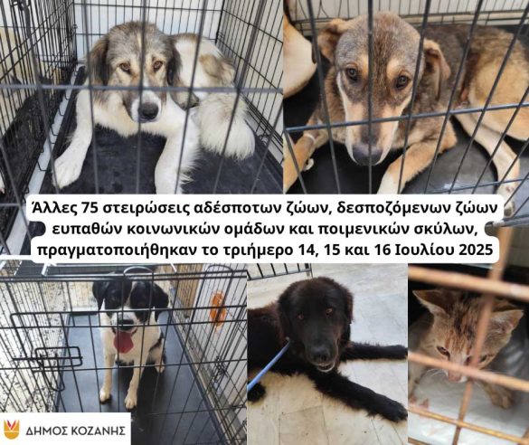Άλλες 75 στειρώσεις αδέσποτων ζώων, δεσποζόμενων ζώων ευπαθών κοινωνικών ομάδων και ποιμενικών σκύλων από το δήμο Κοζάνης το τριήμερο 14, 15 και 16 Ιουλίου 2025