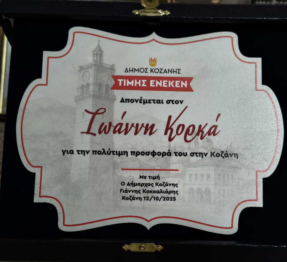 Στα εγκαίνια της έκθεσης ζωγραφικής του Μιχάλη Καραπαναγιωτίδη με τίτλο «Πορτρέτα της Πόλης», που πραγματοποιήθηκαν στην Κοβεντάρειο Δημοτική Βιβλιοθήκη Κοζάνης, τιμήθηκε ο Γιάννης Κορκάς για την πολυετή και πολύτιμη προσφορά του στην κοινωνία και τον πολιτισμό της Κοζάνης.