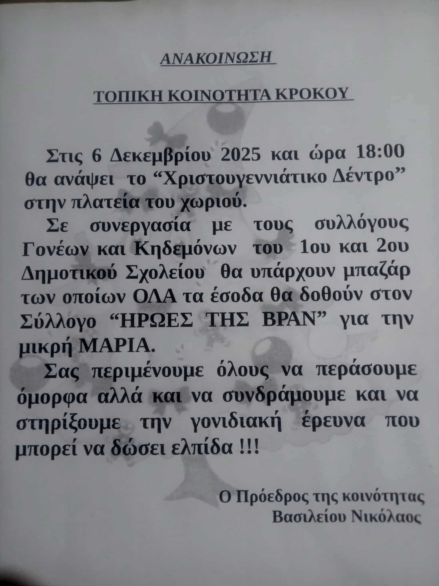 Ανάβει το Δέντρο στον Κρόκο. Μια Ζεστή Γιορτή για τη μικρή Μαρία