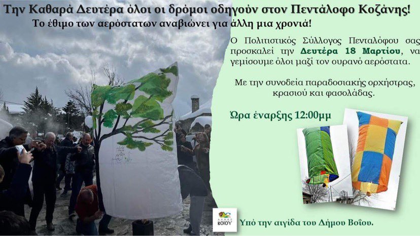 Αναβίωση και φέτος του εθίμου των αερόστατων στον Πεντάλοφο, το μεσημέρι της Καθαράς Δευτέρας με παραδοσιακή μουσική, κρασί και φασολάδα
