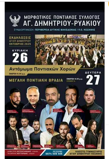 Αντάμωμα Ποντιακών Χορών. Μεγάλη Ποντιακή Βραδιά στον Άγιο Δημήτριο27 Οκτωβρίου