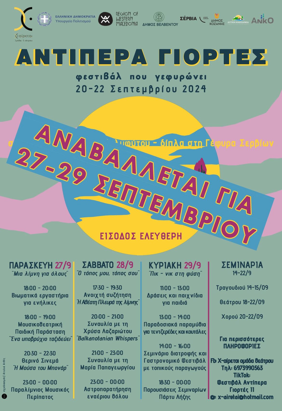 “ΑΝΤΙΠΕΡΑ ΓΙΟΡΤΕΣ 2”. Αναβολή για 27-28-29 Σεπτεμβρίου 2024. Δίπλα από την Υψηλή Γέφυρα