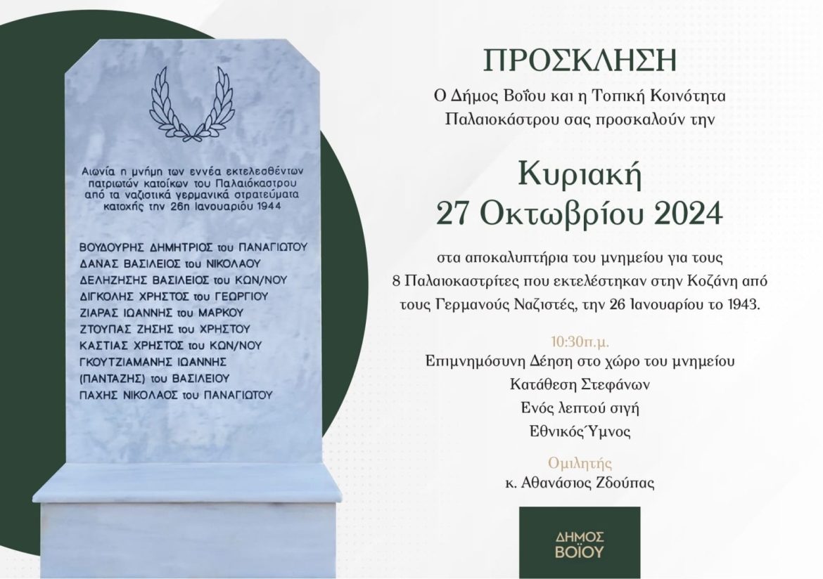 Ο Δήμος Βοΐου και η Τοπική Κοινότητα Παλαιοκάστρου σας προσκαλούν την Κυριακή 27 Οκτωβρίου 2024 στα αποκαλυπτήρια του μνημείου για τους 8 Παλαιοκαστρίτες που εκτελέστηκαν στην Κοζάνη από τους Γερμανούς Ναζιστές, την 26 Ιανουαρίου το 1943.