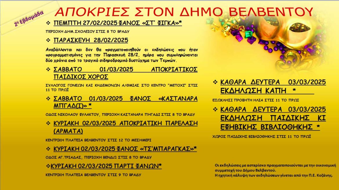 ΑΠΟΚΡΙΕΣ ΣΤΟ ΒΕΛΒΕΝΤΟ – ΔΕΥΤΕΡΗ ΒΔΟΜΑΔΑ & ΚΑΘΑΡΗ ΔΕΥΤΕΡΑ