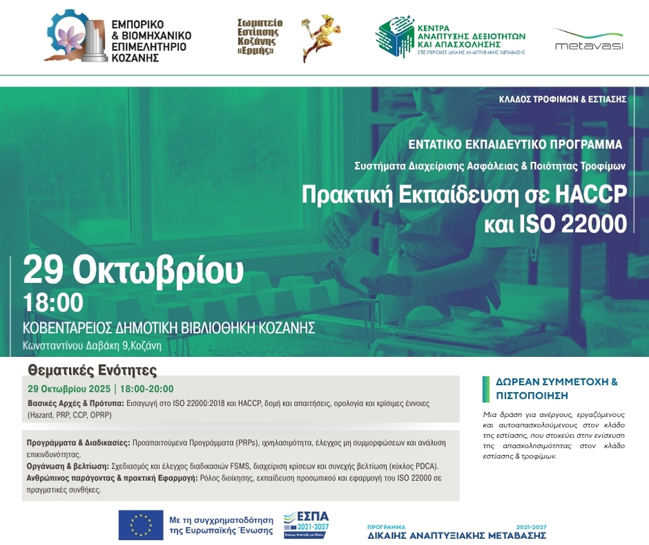 Η Μετάβαση Μ.Α.Ε., σε συνεργασία με το Επιμελητήριο Κοζάνης και το Σωματείο Καφετεριών και Εστίασης Κοζάνης «Ο Ερμής», προχωρούν στην έναρξη ενός νέου, σύγχρονου επιμορφωτικού προγράμματος με τίτλο «Ασφάλεια & Ποιότητα Τροφίμων στην Πράξη – Εκπαίδευση σε ISO 22000:2018 & HACCP», το οποίο πραγματοποιείται στο πλαίσιο των επιμορφωτικών δράσεων των Κέντρων Ανάπτυξης Δεξιοτήτων και Απασχόλησης.