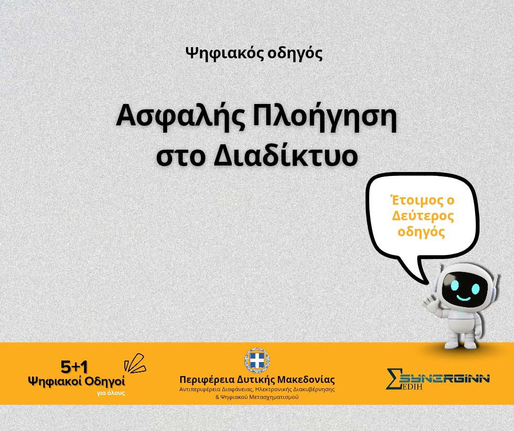 Μετά και την ιδιαίτερα θετική ανταπόκριση που είχε ο πρώτος οδηγός της σειράς με θέμα τις Χρήσιμες Συμβουλές για το gov.gr, η Περιφέρεια Δυτικής Μακεδονίας παρουσιάζει τον δεύτερο οδηγό της σειράς «5+1 Ψηφιακοί Οδηγοί για Όλους» με τίτλο «Ασφαλής Πλοήγηση στο Διαδίκτυο».