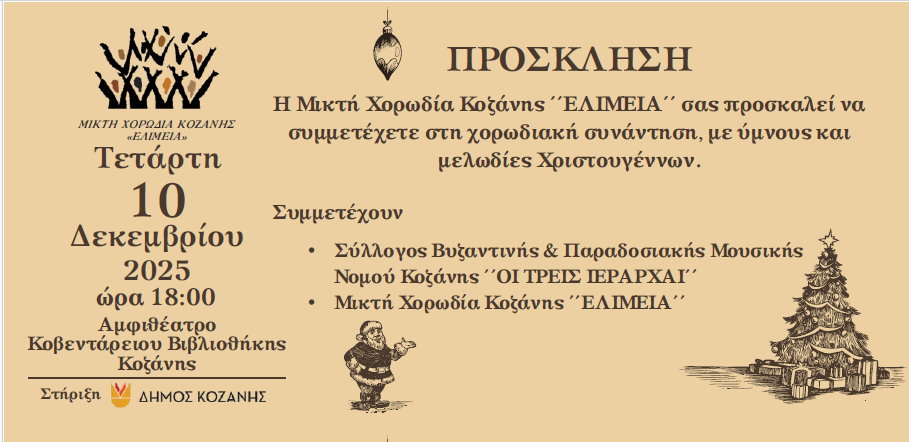 Χορωδιακή Συνάντηση με ύμνους και μελωδίες Χριστουγέννων από τη Μικτή Χορωδία Κοζάνης “ΕΛΙΜΕΙΑ”