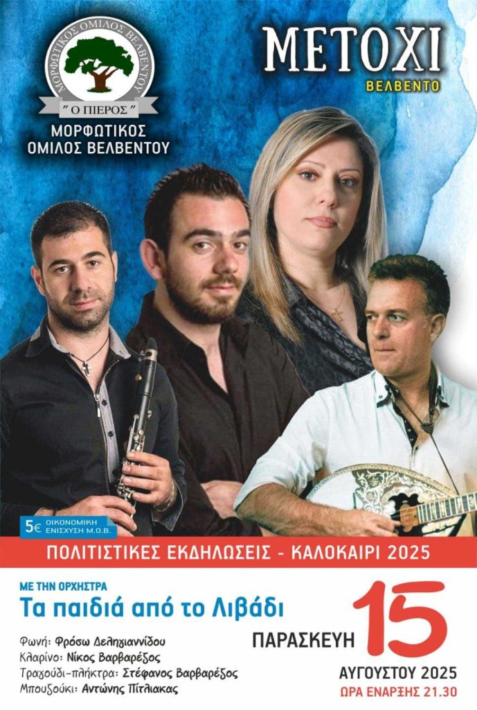 Χοροεσπερίδα του Μορφωτικού Ομίλου Βελβεντού, ανήμερα Δεκαπενταύγουστο στο Βελβεντού, παρέα με την ορχήστρα “Τα Παιδιά από το Λιβάδι”