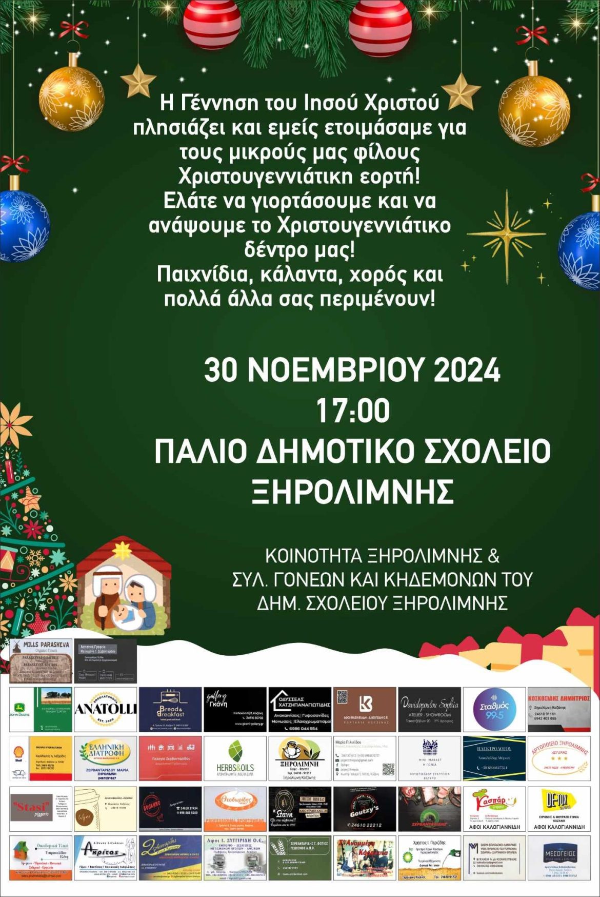 Η Κοινότητα Ξηρολίμνης και ο Σύλλογος Γονέων & Κηδεμόνων του Δημοτικού Σχολείου Ξηρολίμνης ανυπομονούν να σας υποδεχθούν, για να μοιραστούμε τη χαρά των Χριστουγέννων!