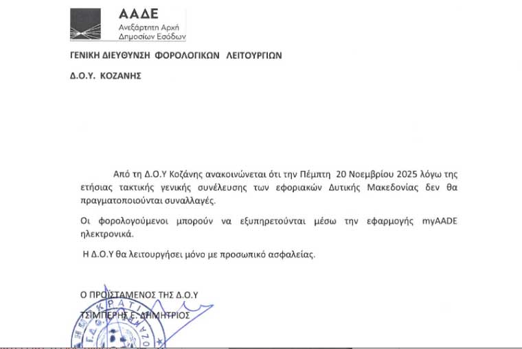 Δεν θα πραγματοποιούνται συναλλαγές στη ΔΟΫ Κοζάνης την Πέμπτη 20 Νοεμβρίου