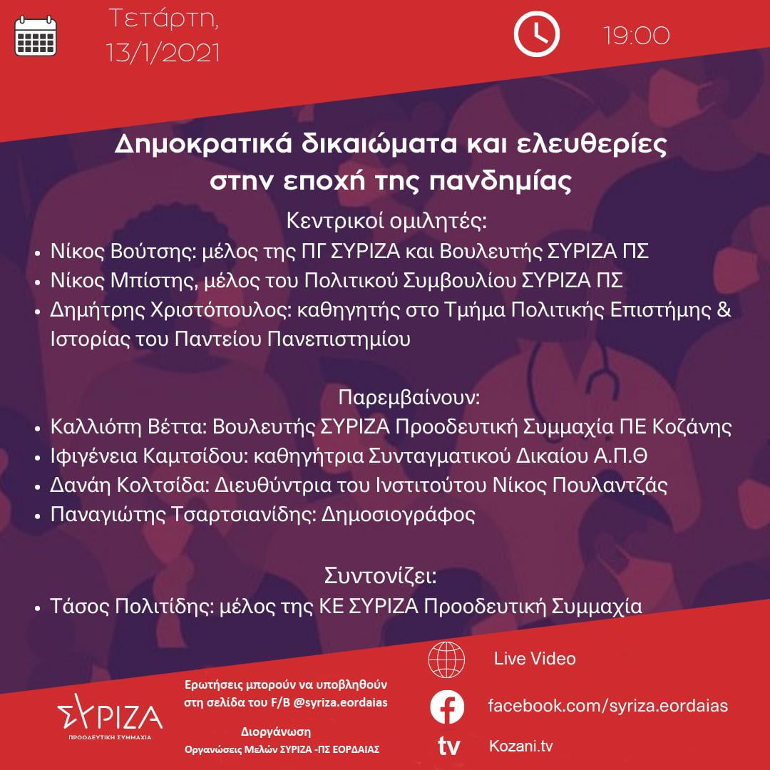 Διαδικτυακή εκδήλωση Των Οργανώσεων Μελών ΣΥΡΙΖΑ Προοδευτική Συμμαχία Εορδαίας που θα πραγματοποιηθεί την Τετάρτη 13/1/2021 στις 19:00μμ, με θέμα: