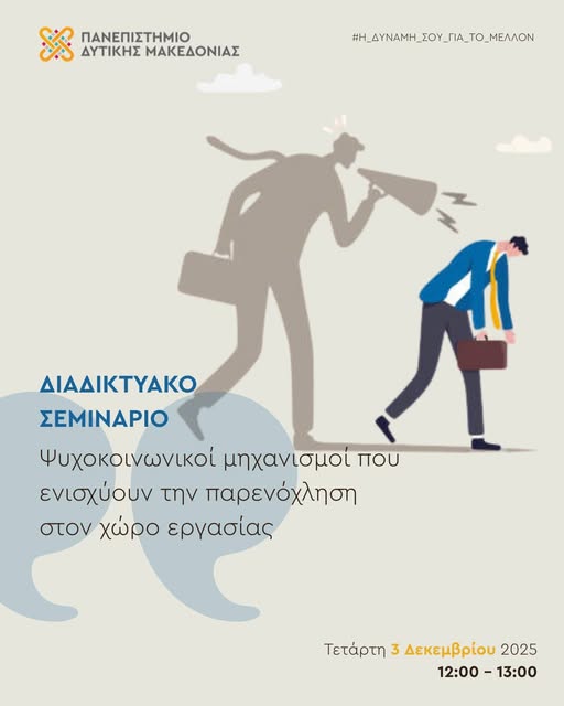 Η Διεύθυνση Μονάδας Ασφάλειας & Προστασίας του ΠΔΜ, σε συνεργασία με το σωματείο No Mobbing at Work, διοργανώνει online σεμινάριο με θέμα: