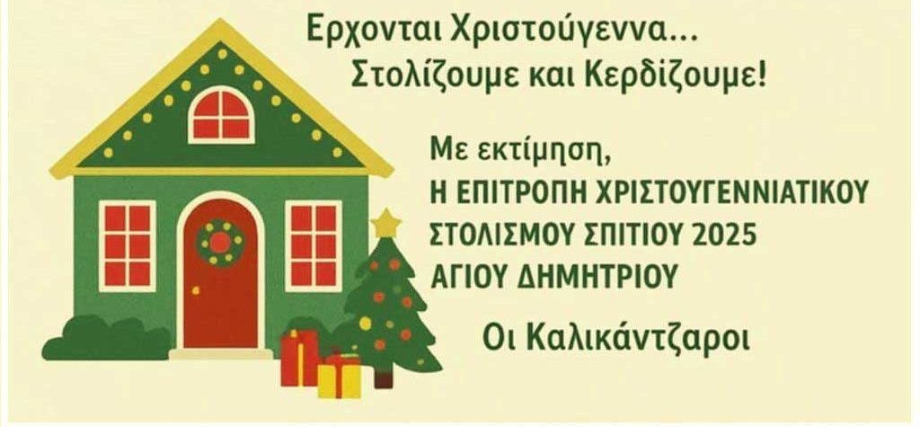 Η Τοπική Κοινότητα Αγίου Δημητρίου σας ενημερώνει ότι φέτος τα Χριστούγεννα θα πραγματοποιηθεί διαγωνισμός για τον Καλύτερο Χριστουγεννιάτικο Στολισμό Σπιτιού 2025 !!!