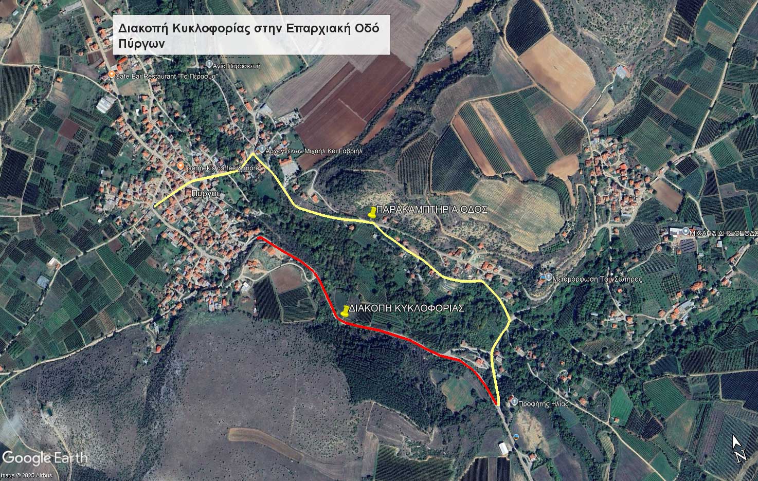 Η Διεύθυνση Τεχνικών Υπηρεσιών της Περιφερειακής Ενότητας Κοζάνης σας ενημερώνει ότι λόγω υποχώρησης τμήματος του οδοστρώματος που έλαβε χώρα στις 10/11/2025 στο 22ο χλμ. του δευτερεύοντος επαρχιακού οδικού δικτύου Πτολεμαΐδας – Ανατολικού – Πύργων – όρια Π.Ε. Φλώρινας, μεταξύ των οικισμών Μεσοβούνου και Πύργων, η Διεύθυνσή μας προχώρησε στην ολική διακοπή κυκλοφορίας των οχημάτων, έως ότου ολοκληρωθούν οι εργασίες αποκατάστασης της οδού.