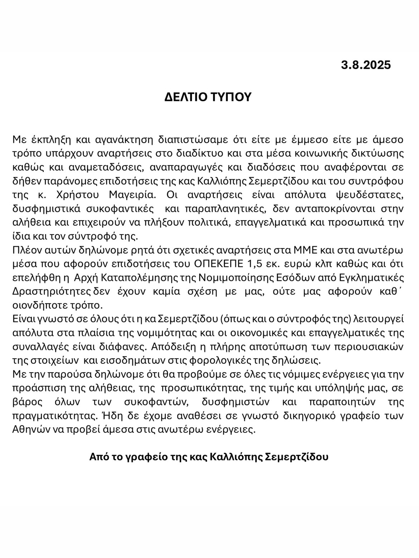 Διαψεύδει η Καλλιόπη Σεμερτζίδου τα δημοσιεύματα σχετικά με την εμπλοκή τη δική της και του συντρόφου της με τον ΟΠΕΚΕΠΕ