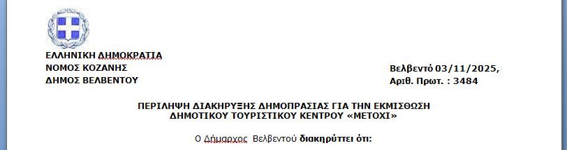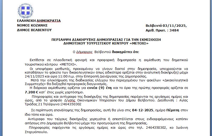 Δημοπρατείται το Δημοτικό Τουριστικό Κέντρο “Μετόχι” Βελβεντού