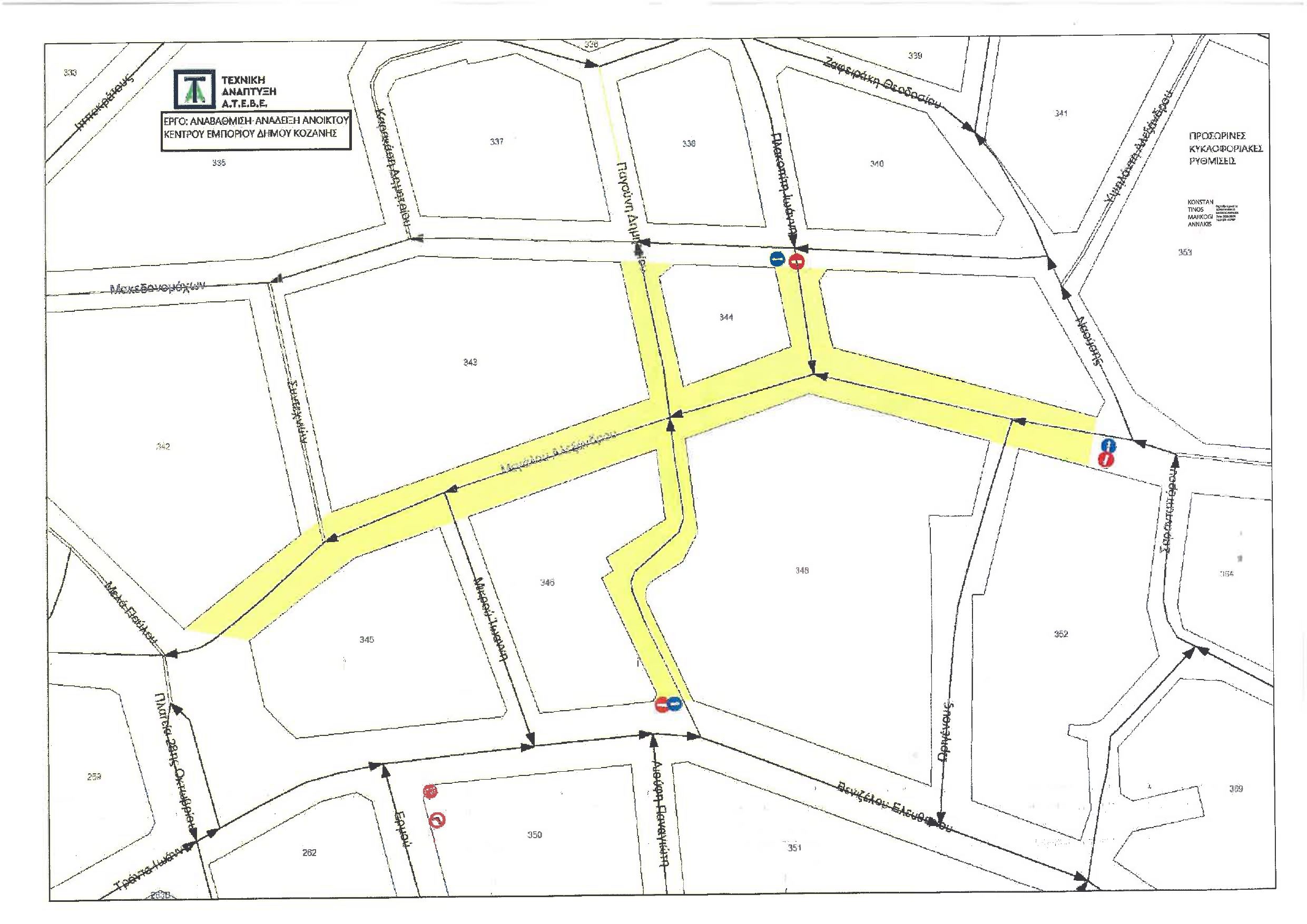 – διακοπή κυκλοφορίας επί της οδού Μεγάλου Αλεξάνδρου, από τη συμβολή της με την οδό Σαρανταπόρου έως την Πλατεία 28ης Οκτωβρίου, για την εκτέλεση εργασιών καθαίρεσης πεζοδρομίων στα πλαίσια του έργου,- διακοπή κυκλοφορίας επί της οδού Πλακοπίτη, από τη συμβολή της με την οδό Μακεδονομάχων έως τη συμβολή της με την οδό Μεγάλου Αλεξάνδρου για απόθεση οικοδομικών υλικών και τεχνικού εξοπλισμού,- διακοπή κυκλοφορίας επί της οδού Παγούνη, από τη συμβολή της με την οδό Ελευθερίου Βενιζέλου έως τη συμβολή της με την οδό Μακεδονομάχων για απόθεση οικοδομικών υλικών και τεχνικού εξοπλισμού,- κατάργηση απαγόρευσης αριστερής στροφής στη συμβολή των οδών Μακεδονομάχων και Παύλου Μελά,- διακοπή λειτουργίας του προγράμματος των φωτεινών σηματοδοτών και την λειτουργία του κόμβου με την υφιστάμενη κατακόρυφη σήμανση.