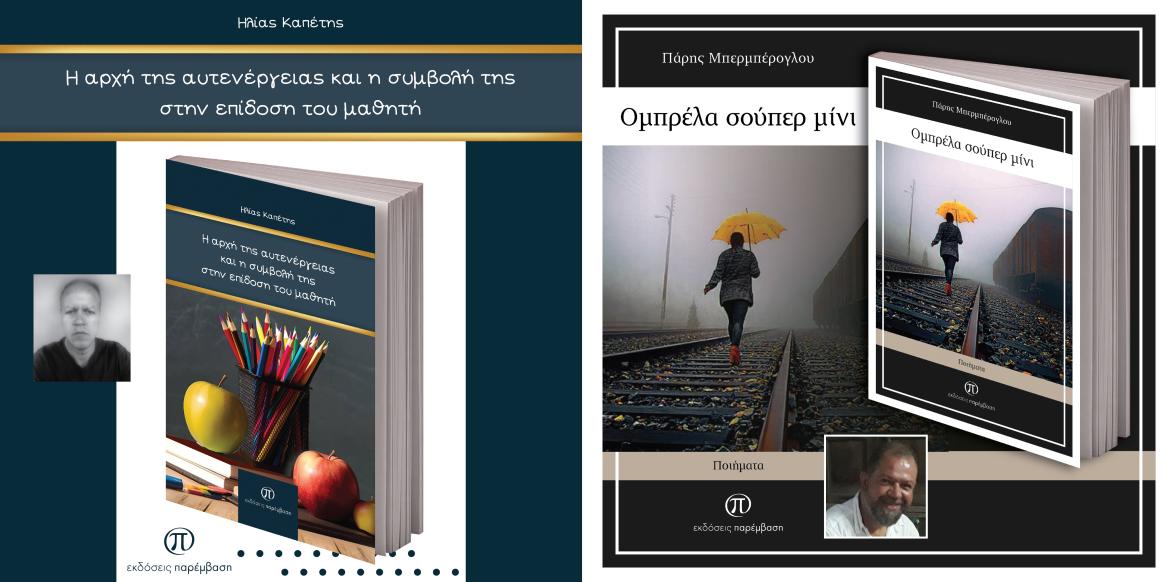 Δύο νέα βιβλία κυκλοφόρησαν από τις Εκδόσεις Παρέμαβση, «Η αρχή της αυτενέργειας και η συμβολή της στην επίδοση του μαθητή» και «Ομπρέλα σούπερ μίνι» των Ηλία Καπέτη και Πάρη Μπερμπέρογλου, αντίστοιχα.
