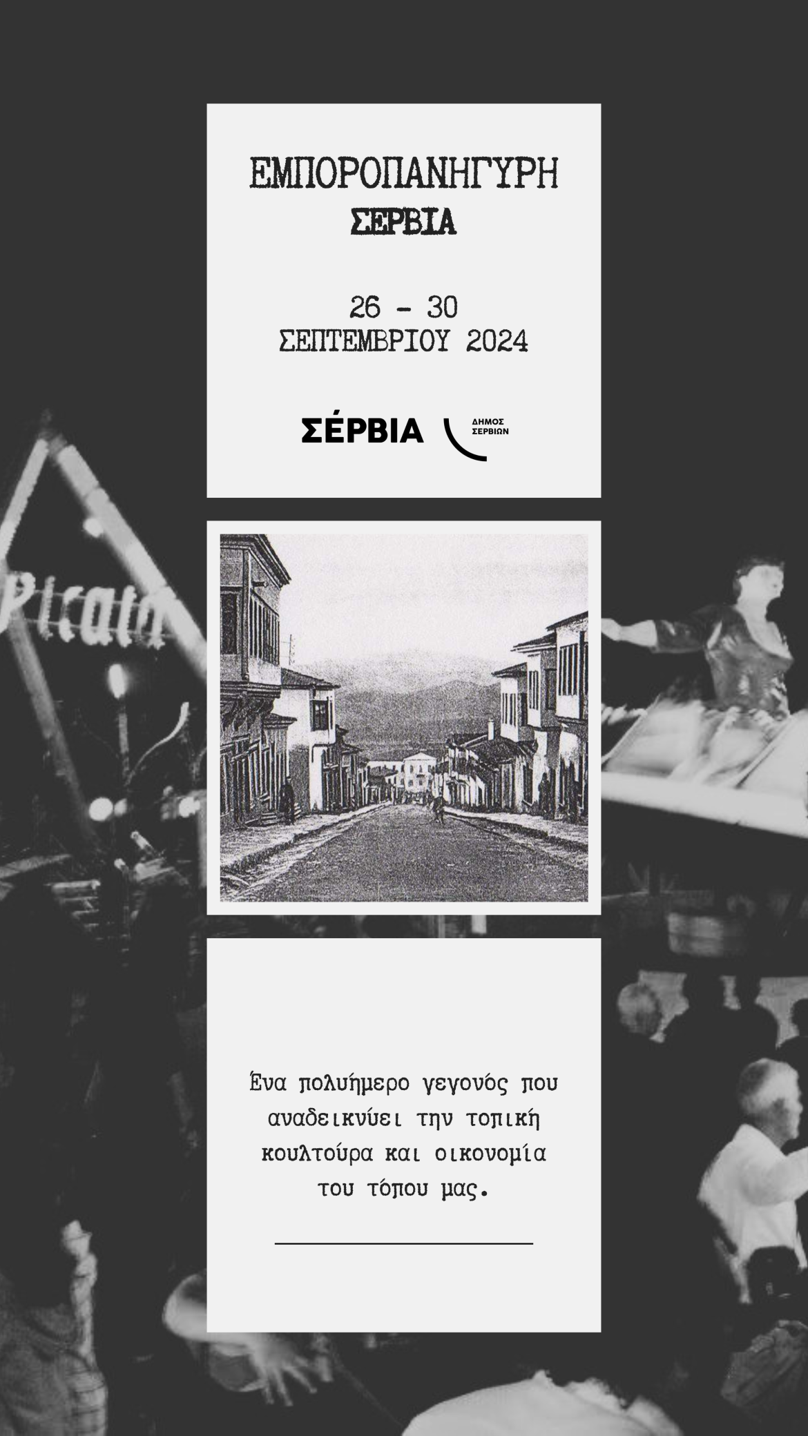Καλούμε όλους τους κατοίκους της περιοχής και τους επισκέπτες να συμμετάσχουν στην Εμποροπανήγυρη Σερβίων 2024, στηρίζοντας την τοπική οικονομία και απολαμβάνοντας τις αγορές τους σε μια ιδιαίτερη ατμόσφαιρα.