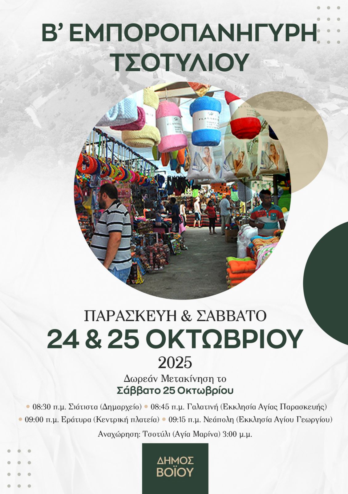 Η καθιερωμένη Εμποροπανήγυρη Τσοτυλίου επιστρέφει και φέτος, προσκαλώντας μικρούς και μεγάλους σε ένα διήμερο γεμάτο παράδοση, ψυχαγωγία και εμπορική δραστηριότητα, την Παρασκευή 24 και το Σάββατο 25 Οκτωβρίου. Για την καλύτερη εξυπηρέτηση των επισκεπτών, το Σάββατο θα πραγματοποιηθεί δωρεάν μετακίνηση από Σιάτιστα, Γαλατινή, Εράτυρα και Νεάπολη προς το Τσοτύλι.