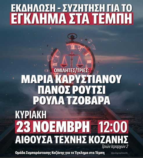 Η Ομάδα Συμπαράστασης Κοζάνης για το Έγκλημα στα Τέμπη διοργανώνει την Κυριακή 23 Νοεμβρίου 2025, στις 12:00, στην Αίθουσα Τέχνης Κοζάνης, εκδήλωση – ανοιχτή συζήτηση αφιερωμένη στη διεκδίκηση δικαιοσύνης για την τραγωδία των Τεμπών και στην ανάγκη να παραμείνει ζωντανός ο δημόσιος αγώνας απέναντι στη συγκάλυψη και την αδιαφάνεια.
