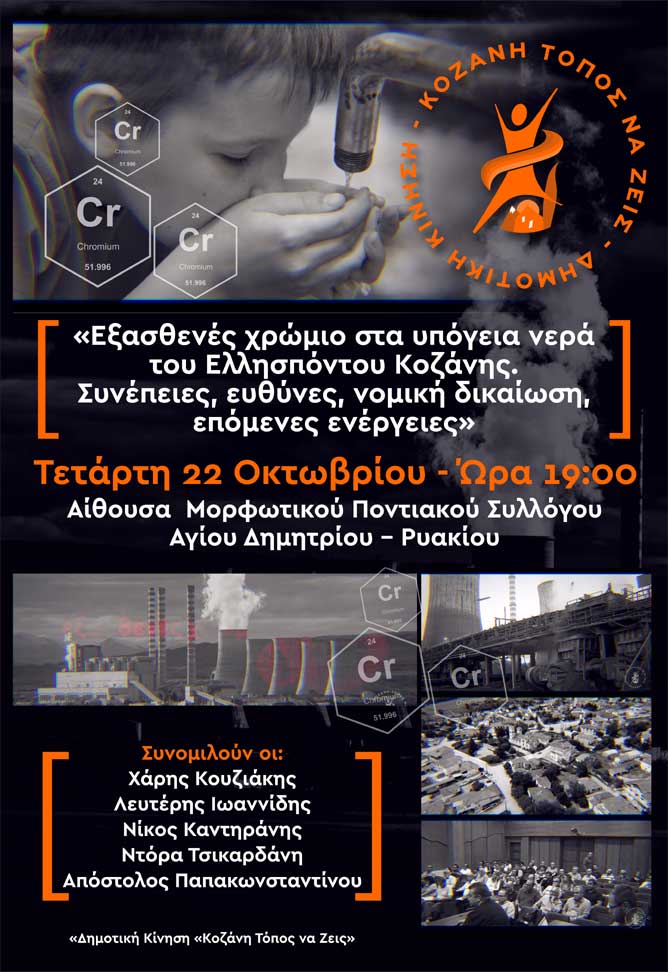 Για τους παραπάνω λόγους η Δημοτική Κίνηση «Κοζάνη Τόπος να Ζεις» σας προσκαλεί στην εκδήλωση με θέμα «Εξασθενές χρώμιο στα υπόγεια νερά του Ελλησπόντου Κοζάνης. Συνέπειες, ευθύνες, νομική δικαίωση, επόμενες ενέργειες» που διοργανώνει την Τέταρτη 22 Οκτωβρίου και ώρα 19:00 στην αίθουσα του Μορφωτικού Ποντιακού Συλλόγου Αγίου Δημητρίου – Ρυακίου στην ΤΚ Αγίου Δημητρίου Κοζάνης.