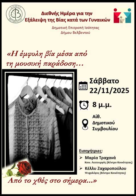 Στα πλαίσια της Διεθνούς Ημέρας για την Εξάλειψη της Βίας κατά των Γυναικών, η Δημοτική Επιτροπή Ισότητας του Δήμου Βελβεντού διοργανώνει εκδήλωση με θέμα: «Η έμφυλη βία μέσα από τη μουσική παράδοση, από το χθες στο σήμερα…».