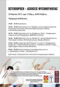 Η Δημοτική Κοινωφελής Επιχείρηση Κοινωνικής Πρόνοιας και Μέριμνας Δ. Κοζάνης, το Π.Τ Συνδέσμου Κοινωνικών Λειτουργών Δυτ. Μακεδονίας, ο Σύλλογος Γενικών Οικογενειακών Ιατρών Δυτ. Μακεδονίας και το Π.Τ Δυτικής Μακεδονίας του Πανελληνίου Συλλόγου Φυσιοθεραπευτών, διοργανώνουν εκδήλωση αναφορικά με την Πρόληψη της Οστεοπόρωσης και των Πτώσεων, την Τετάρτη, 22/3/2017 και ώρα 18:00 μ.μ, στο ΚΑΠΗ Κοζάνης, επί της οδού Φον Κοζάνη & Γρανικού. Κατά τη διάρκεια θα πραγματοποιηθούν και ενδεικτικές ασκήσεις φυσιοθεραπείας.