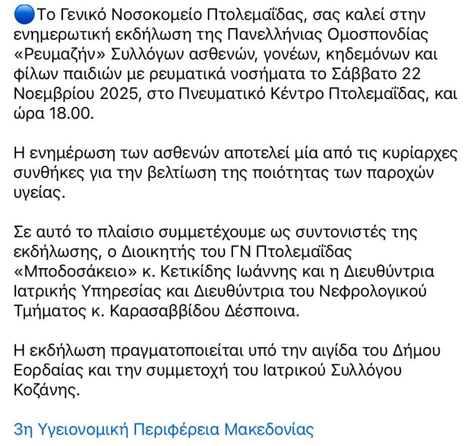 Εκδήλωση της Πανελλήνιας Ομοσπονδίας”Ρευμαζήν” στην Πτολεμαϊδα 22 Νοεμβρίου