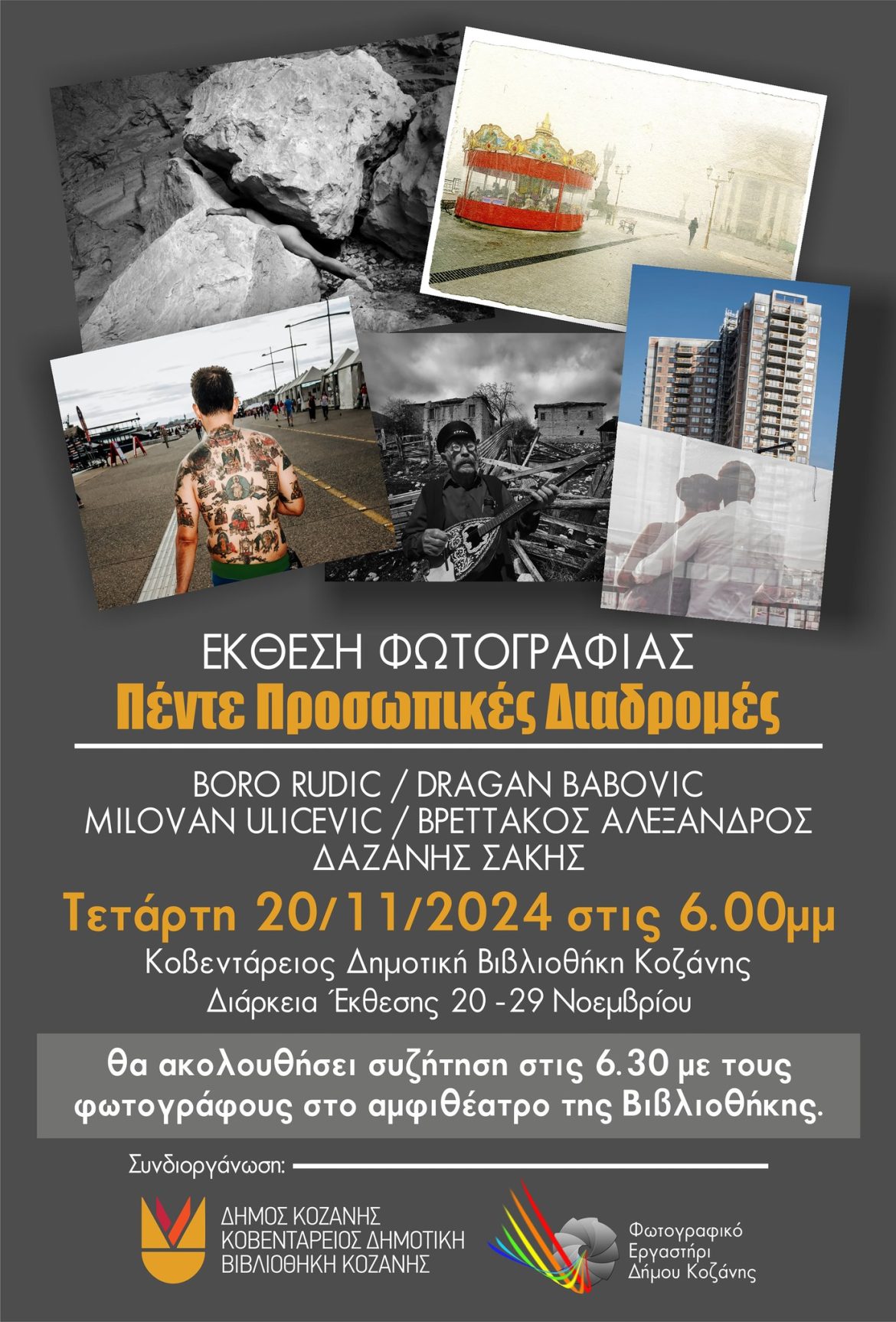Έκθεση Φωτογραφίας «Πέντε Προσωπικές Διαδρομές» στην Κοβεντάρειο Δημοτική Βιβλιοθήκη Κοζάνης – Εγκαίνια την Τετάρτη 20 Νοεμβρίου 2024 στις 18:00 το απόγευμα – Σας περιμένουμε!