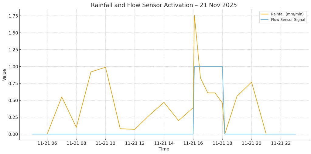 Κατά τη διάρκεια της βροχόπτωσης, ενεργοποιήθηκε ο αισθητήρας ανίχνευσης ροής στο ρέμα Σιόποτο, υποδεικνύοντας την παρουσία ροής νερού στο ρέμα.