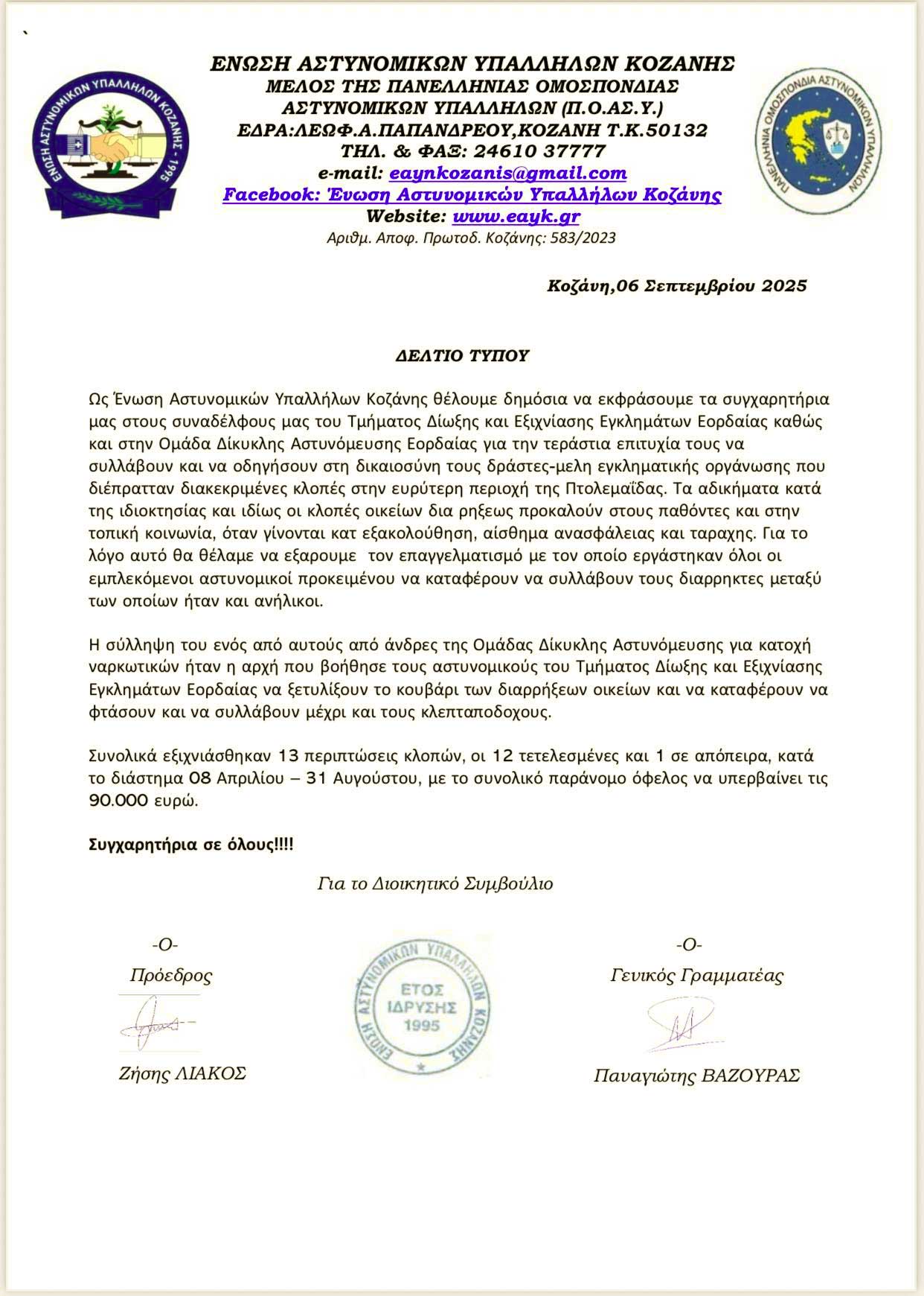 Ένωση Αστυνομικών Υπαλλήλων Κοζάνης: Συγχαρητήρια στους συναδέλφους μας!!!!