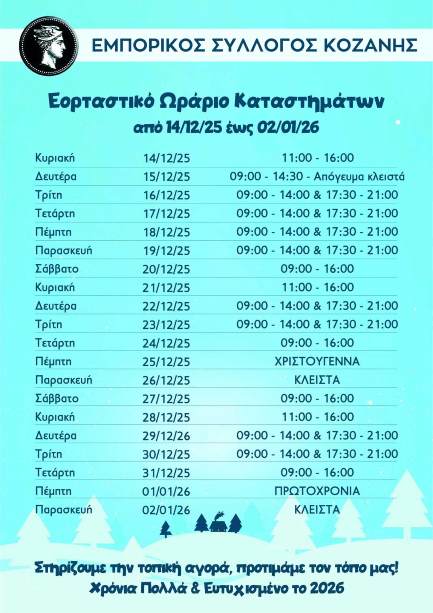 Εορταστικό Ωράριο των καταστημάτων για τις ημέρες των Χριστουγέννων και της Πρωτοχρονιάς.