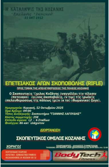 O Σκοπευτικός Όμιλος Κοζάνης διοργανώνει επετειακό αγώνα RIFLE τυφεκίου προς τιμής της απελευθέρωσης της πόλης Κοζάνη από τον Οθωμανικό ζυγό στης 12-10-2025 ημέρα Κυριακή και ώρα 9.00πμ.