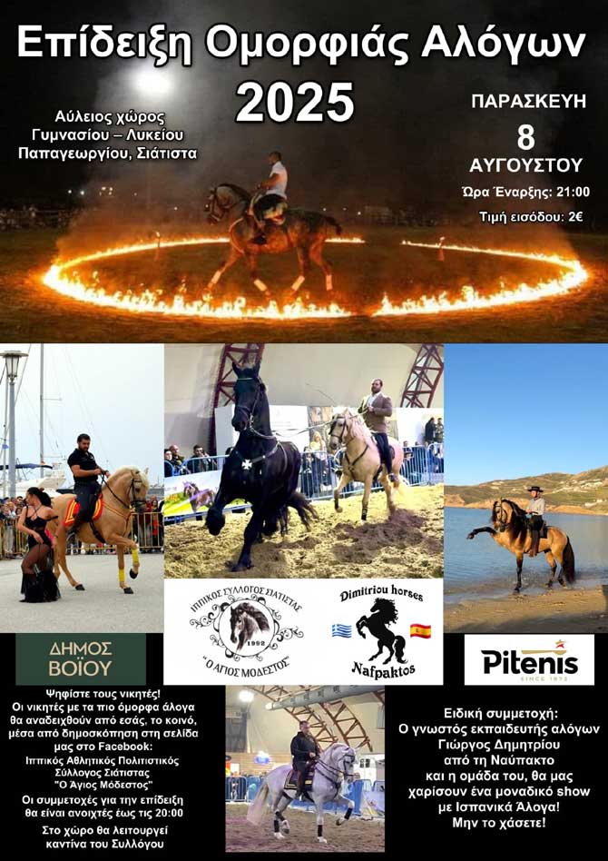 Η Σιάτιστα ετοιμάζεται να υποδεχτεί μία από τις πιο εντυπωσιακές εκδηλώσεις του καλοκαιριού! Η Επίδειξη Ομορφιάς Αλόγων 2025 θα πραγματοποιηθεί την Παρασκευή 8 Αυγούστου, στον αύλειο χώρο του Γυμνασίου – Λυκείου Παπαγεωργίου, με ώρα έναρξης τις 21:00. Η τιμή εισόδου είναι συμβολική, μόλις 2€, δίνοντας την ευκαιρία σε όλους να απολαύσουν ένα μοναδικό θέαμα.